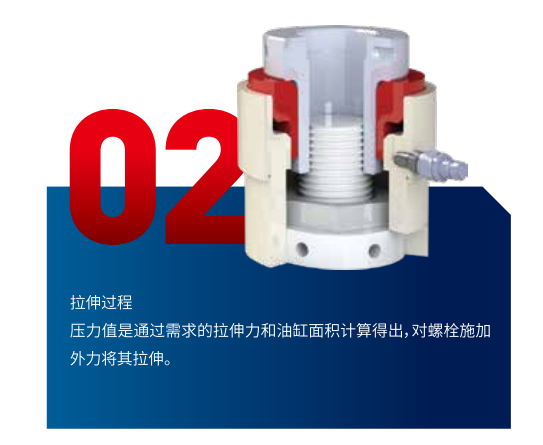 对螺栓施加的载荷与液压缸中的油压成正比关系,这样的设计能够非常精确地留住有效载荷。由于载荷直接施加在螺栓上,且所有作用力都用于螺栓拉长,因此载荷产生所需的空间可以达到最小。螺栓拉伸器最大的优点可以使多个螺栓同时被定值紧固和拆卸,布力均匀,是一种安全、高效、快捷的工具。