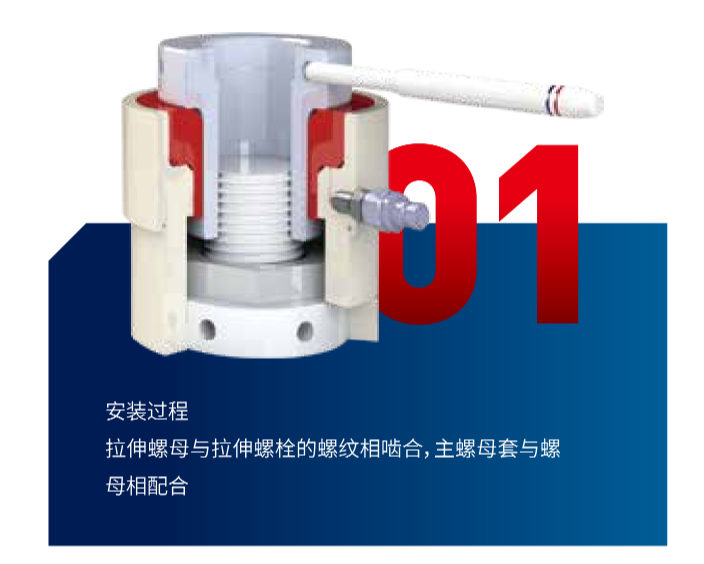 螺栓拉伸器安装螺栓中轴线的位置,用于对螺栓进行轴向拉伸,实现螺栓需要的拉伸量,而正是螺栓的这种拉伸量决定了螺栓紧固所需的夹紧力。螺栓受到拉伸时,螺母会与法兰接触面脱离开来,螺栓拉伸器下端裙座有一个开口,供操作人转动螺母,通常螺母的转动是通过一根拨杆来拨动六角螺母外的一个拨环来实现的(或直接拨动圆螺母)。卸掉螺栓拉伸器中的油压后,螺母和接合面紧贴,从而将螺栓的轴向形变锁住,也就是将剩余的螺栓载荷锁在螺母里。