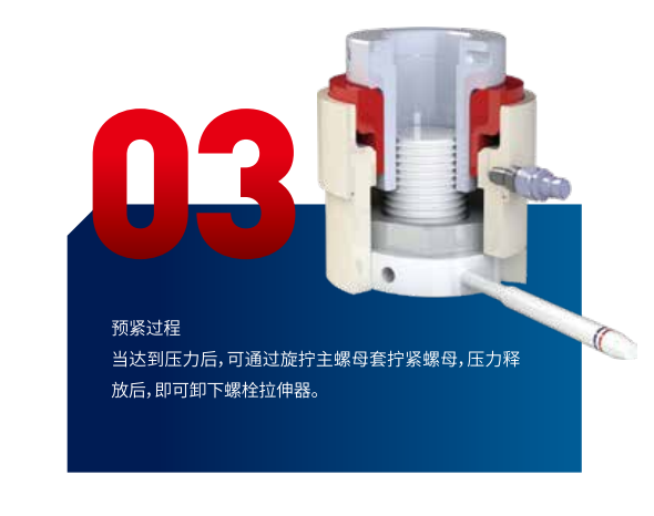 对螺栓施加的载荷与液压缸中的油压成正比关系,这样的设计能够非常精确地留住有效载荷。由于载荷直接施加在螺栓上,且所有作用力都用于螺栓拉长,因此载荷产生所需的空间可以达到最小。螺栓拉伸器最大的优点可以使多个螺栓同时被定值紧固和拆卸,布力均匀,是一种安全、高效、快捷的工具。